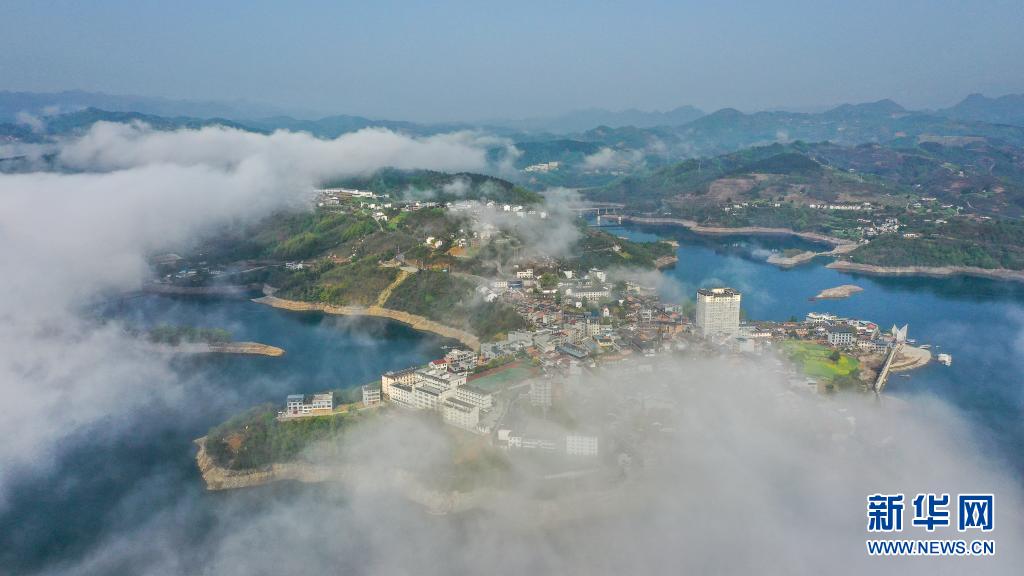 3月28日拍攝的云霧中的流水鎮(zhèn)(無(wú)人機(jī)照片)。