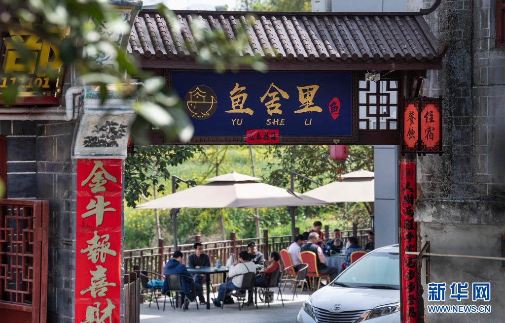 游人在流水鎮(zhèn)的古街上體驗農家樂(3月27日攝)。