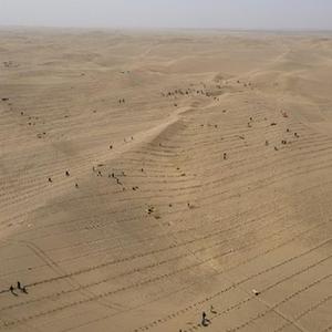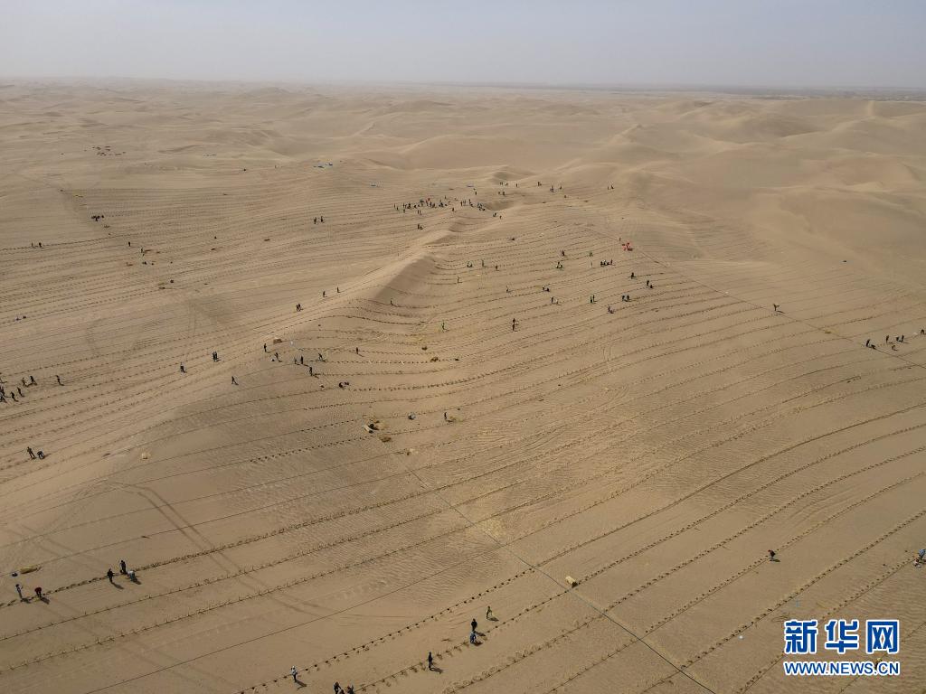 3月28日,人們?cè)谇夷┛h城不遠(yuǎn)處的塔克拉瑪干沙漠內(nèi)植樹(無人機(jī)照片)。