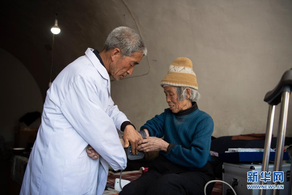 在山西省呂梁市石樓縣鐵頭村張家灣自然村,張尚保(左)在為村民測量血壓(3月23日攝)。新華社記者 楊晨光 攝