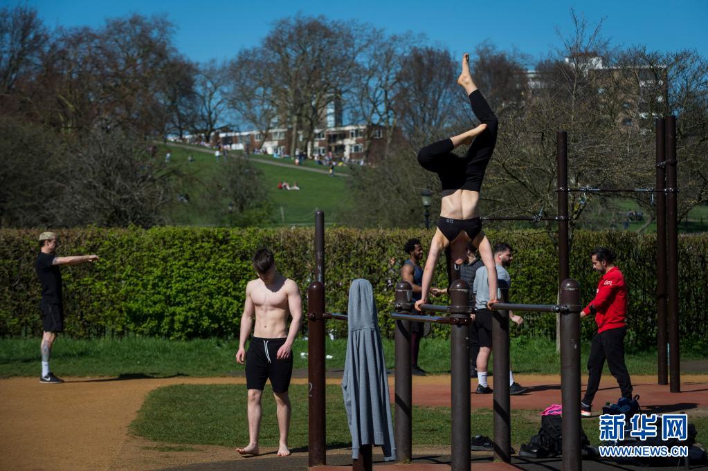 3月29日,人們?cè)谟?guó)倫敦報(bào)春花山的戶外健身區(qū)域鍛煉。