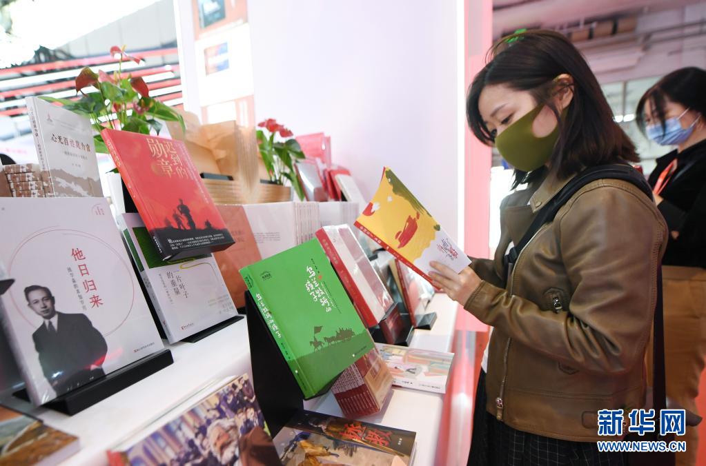 3月31日,參展人員在2021北京圖書(shū)訂貨會(huì)上閱覽書(shū)籍。