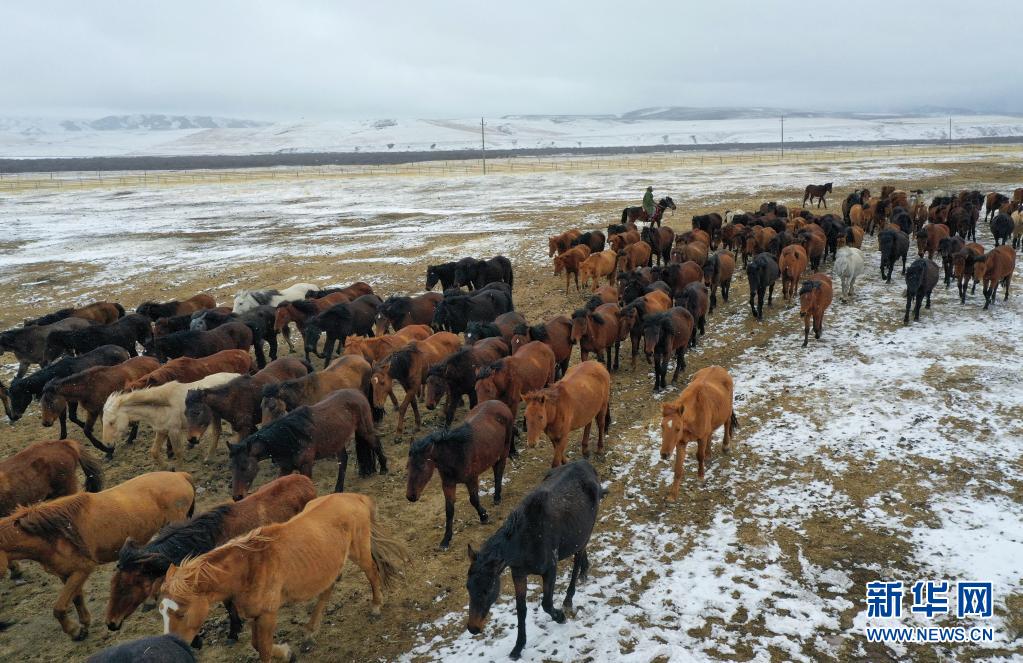 3月31日在山丹馬場(chǎng)拍攝的風(fēng)雪中的馬群(無(wú)人機(jī)照片)。