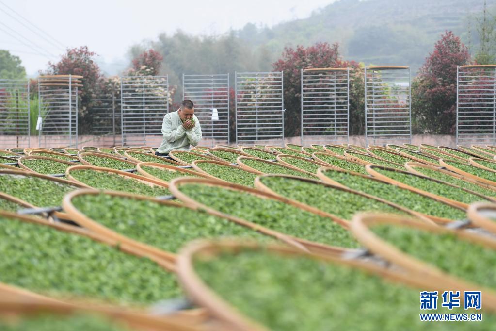 4月2日,制茶師傅在福鼎佳陽畬族鄉(xiāng)一茶廠識別日曬茶葉的香氣。新華社記者 林善傳 攝
