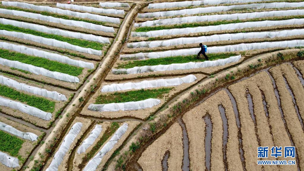 4月5日,在福建省龍巖市永定區(qū)培豐鎮(zhèn),農(nóng)民在田間勞作(無人機照片)。