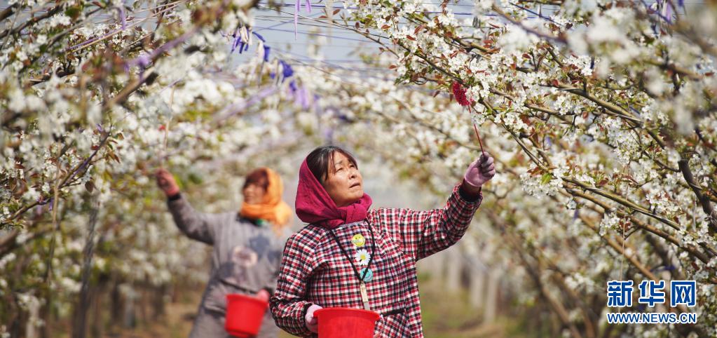 4月6日,山東濱州鄒平市長山鎮(zhèn)八方農(nóng)場(chǎng)的果農(nóng)在給梨花授粉。