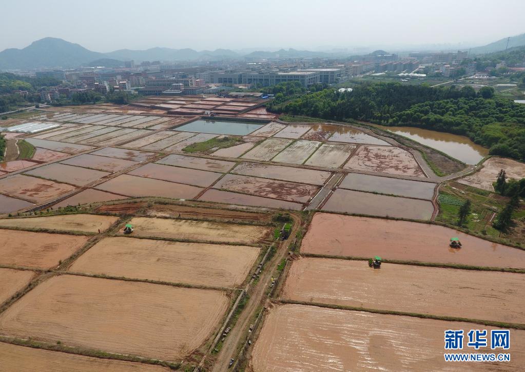 4月6日,浙江省金華市武義縣白洋街道沈宅村農(nóng)民駕駛農(nóng)機在田間插種早稻(無人機照片)。