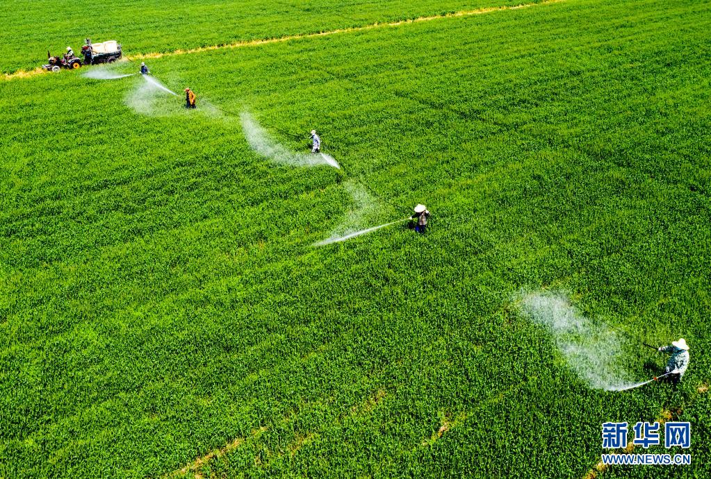 4月6日,安徽省合肥市廬江縣白湖鎮(zhèn)白湖社區(qū),農(nóng)民在田間進(jìn)行小麥赤霉病防治作業(yè)。
