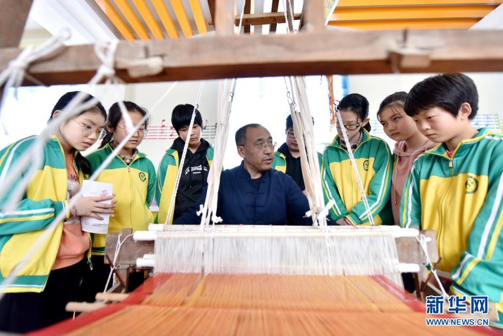 4月7日,威縣土布紡織技藝傳承人高慶海在威縣第四小學(xué)向?qū)W生講解老粗布紡織技藝。近年來,河北省邢臺市威縣積極開展“非遺傳承進(jìn)校園”活動,將當(dāng)?shù)靥厣沁z項目引入學(xué)校課堂,讓學(xué)生近距離感受民間傳統(tǒng)技藝的魅力,促進(jìn)非遺文化的保護(hù)和傳承。新華社記者 朱旭東 攝