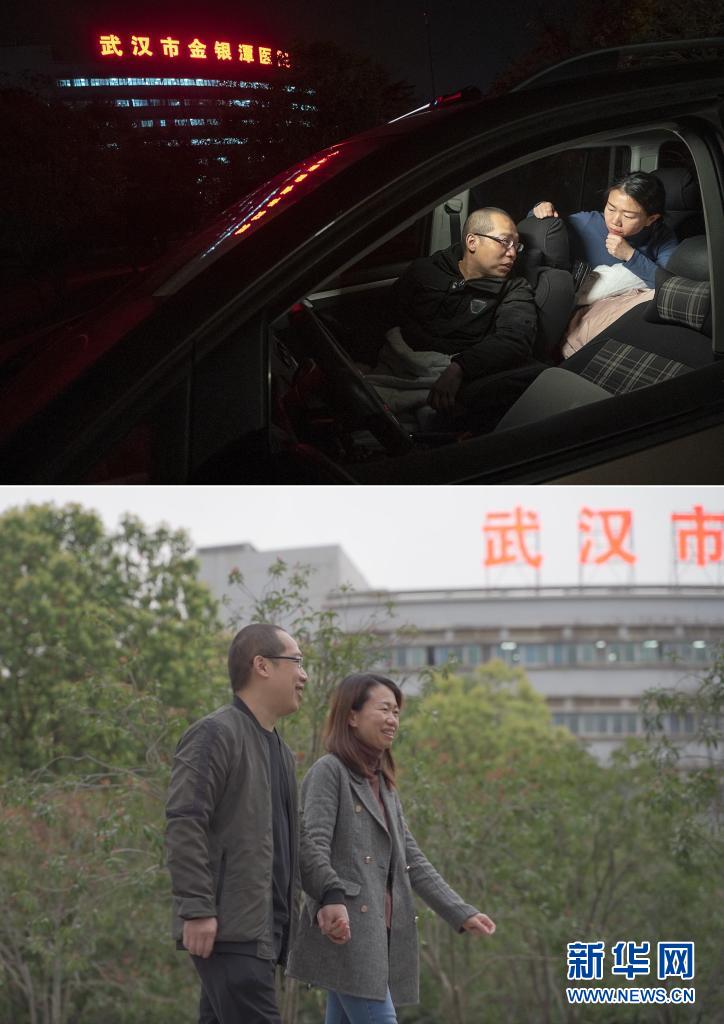 這是一張拼版照片,上圖為:2020年2月22日晚,武漢市金銀潭醫(yī)院的醫(yī)護(hù)夫妻涂盛錦(左)與曹珊在車內(nèi)聊天。從大年初一開始,兩人就住進(jìn)車?yán)铮瑸樵谝咔橹袚尵炔』?,爭分奪秒,以車為家;下圖為:3月23日,武漢市金銀潭醫(yī)院的醫(yī)護(hù)夫妻涂盛錦和曹珊在下班路上。新華社記者 熊琦 攝