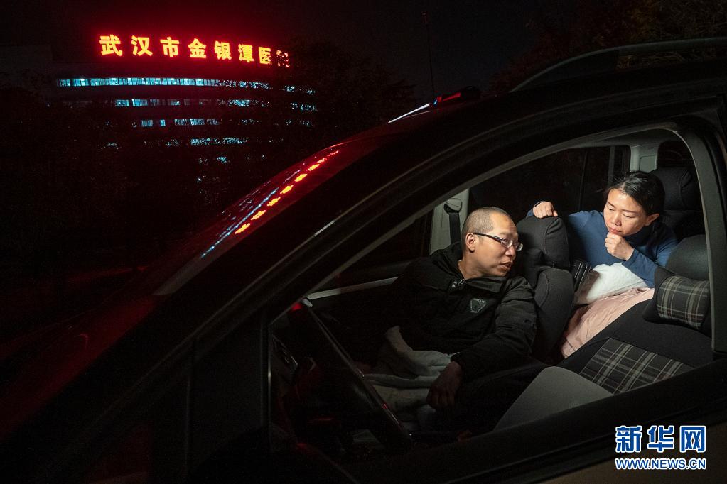 2020年2月22日晚,武漢市金銀潭醫(yī)院的醫(yī)護(hù)夫妻涂盛錦(左)與曹珊在車內(nèi)聊天。從大年初一開(kāi)始,兩人就住進(jìn)車?yán)?,為在疫情中搶救病患,?zhēng)分奪秒,以車為家。新華社記者 熊琦 攝