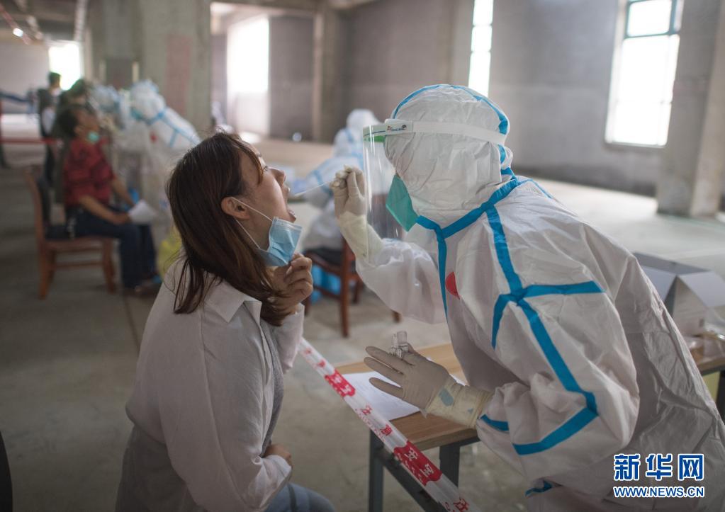 2020年5月15日,在武漢華生漢口城市廣場四期檢測點,工作人員對市民進(jìn)行核酸檢測。新華社記者 肖藝九 攝