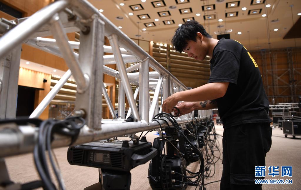 4月10日,工作人員在檢查主會(huì)場(chǎng)燈光設(shè)備。