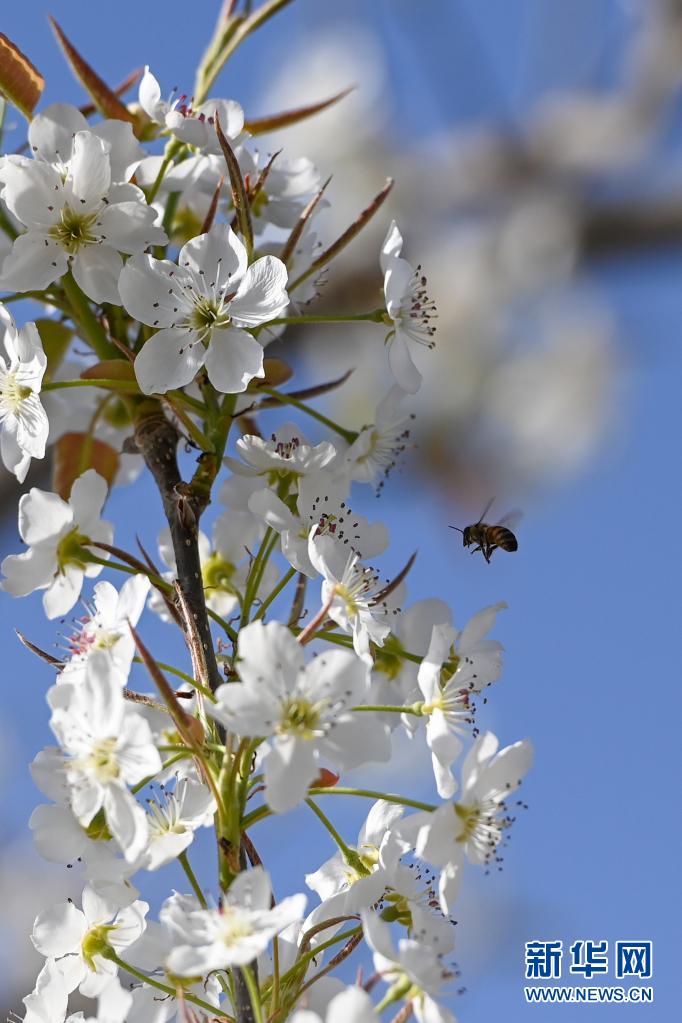 4月11日,在鐵門關(guān)市一處梨園,蜜蜂在授粉。新華社記者 丁磊 攝