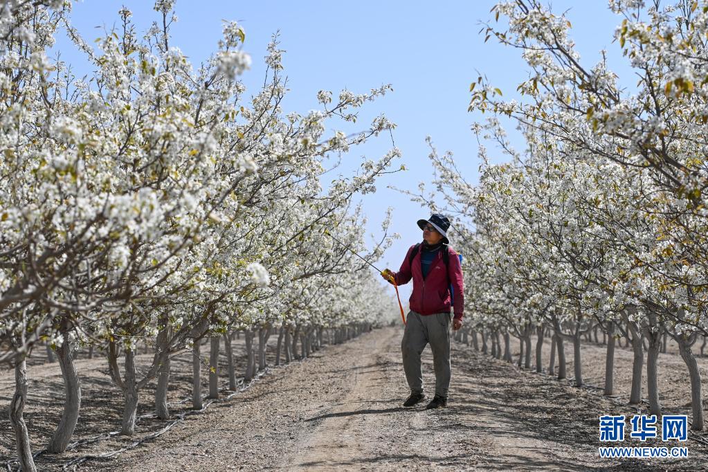 4月11日,在鐵門關(guān)市一處梨園,梨農(nóng)為梨花授粉。新華社記者 丁磊 攝
