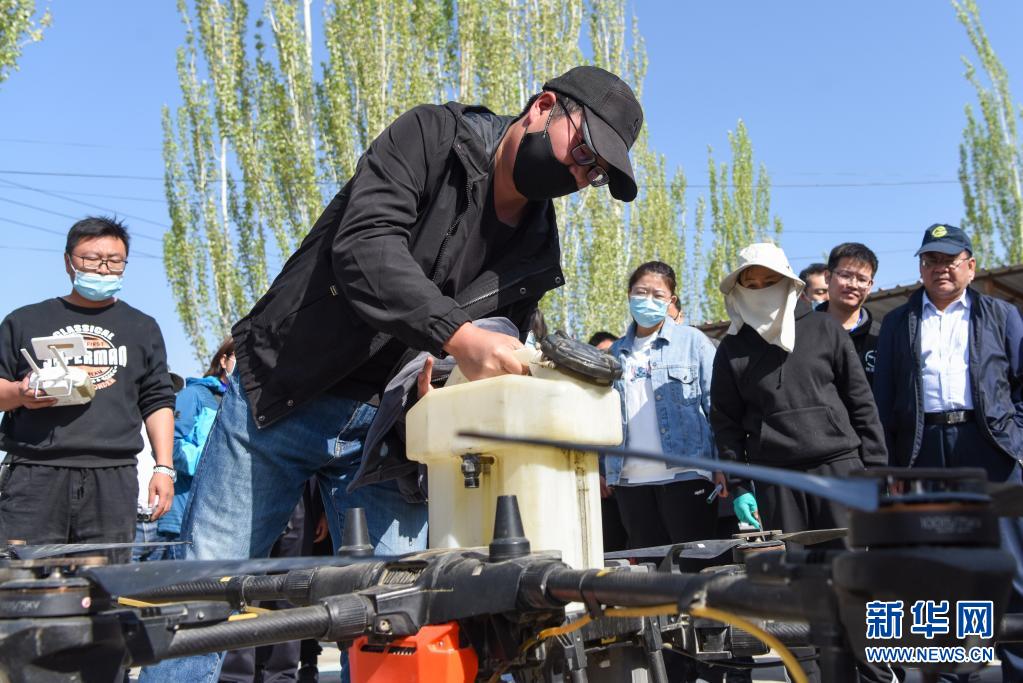 4月11日,在鐵門關(guān)市一處香梨示范園,技術(shù)人員將配制好的花粉稀釋液裝入植保無人機。新華社記者 丁磊 攝