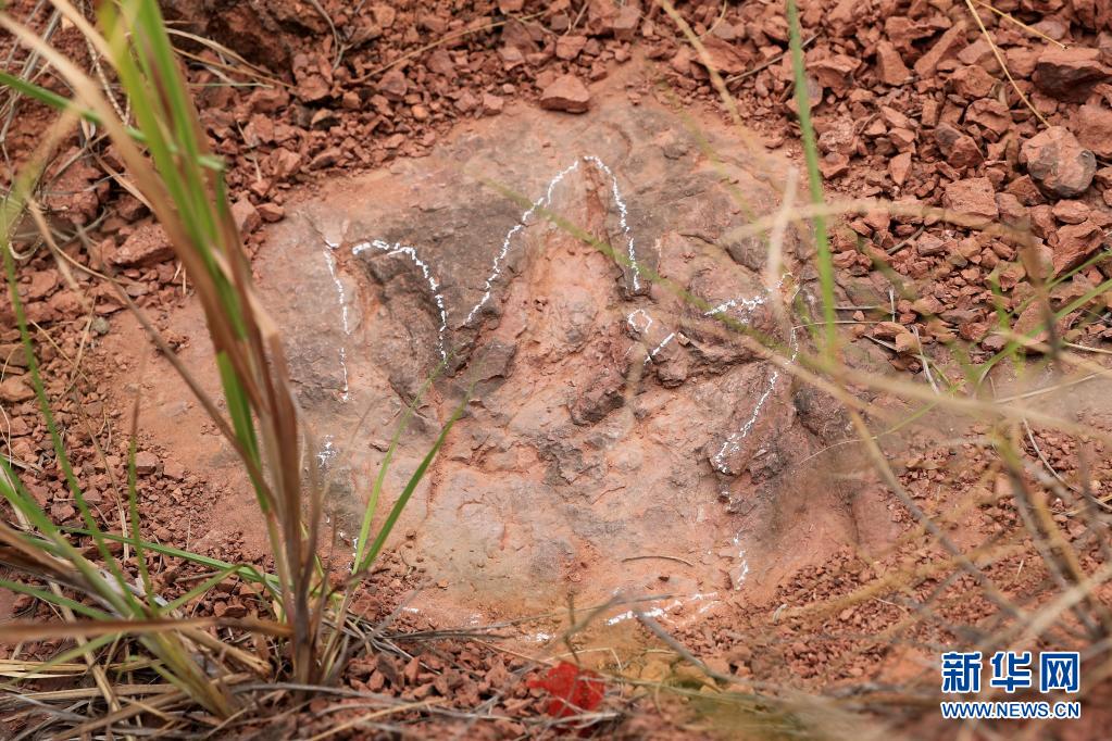 這是被雨水沖刷后的恐龍足跡化石(4月6日攝)。