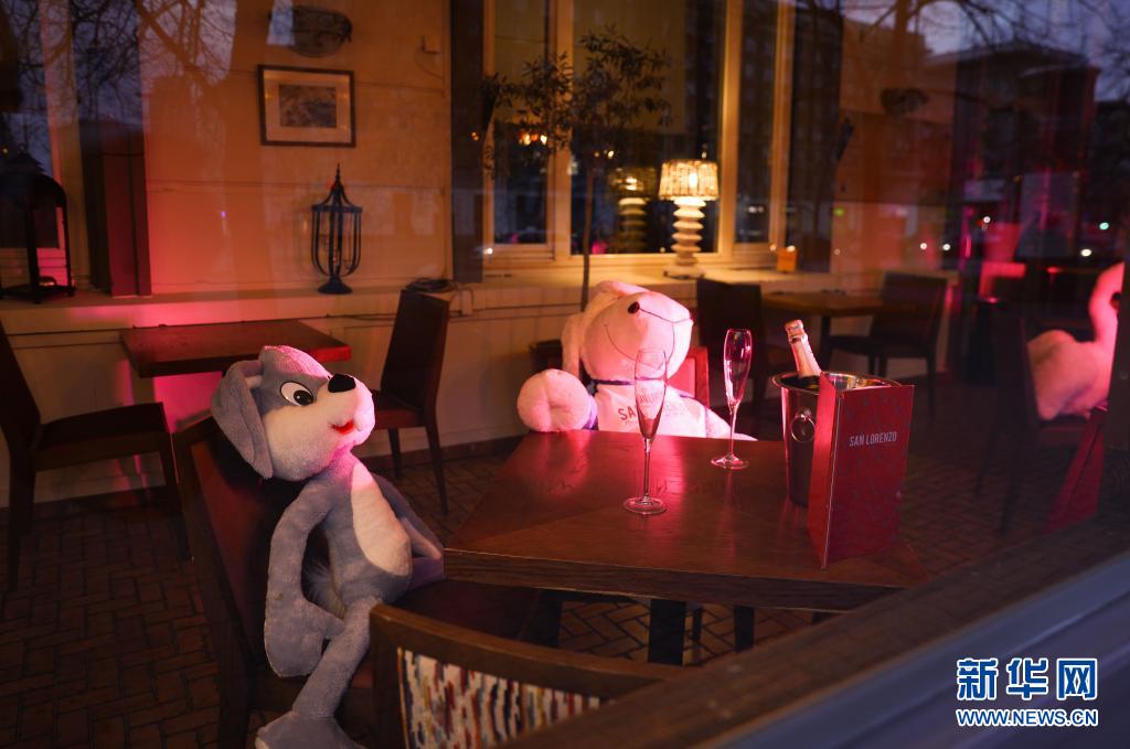 4月13日,波蘭首都華沙一家餐館將動物玩偶擺放在靠窗座位上吸引顧客。