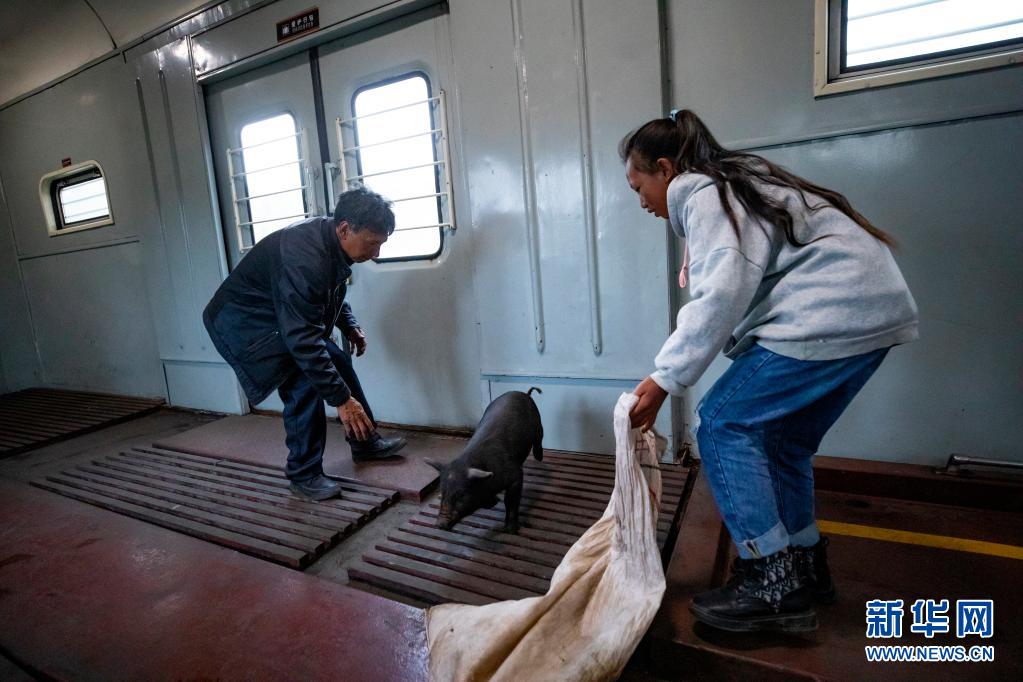 在5633次列車的行李車廂,乘客準(zhǔn)備把他們帶上車的小豬裝到袋子里。為了方便群眾運(yùn)送動(dòng)物,5633/5634次列車對(duì)行李車廂專門進(jìn)行改造,黃牛、山羊、豬、馬,都是這兒的“??汀?。新華社記者 沈伯韓 攝