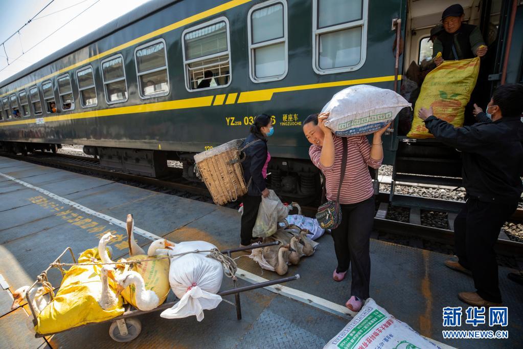 5633次列車??寇囌竞螅妥逍∩特溍χ沿浶断聛恚?月11日攝)。新華社記者 沈伯韓 攝