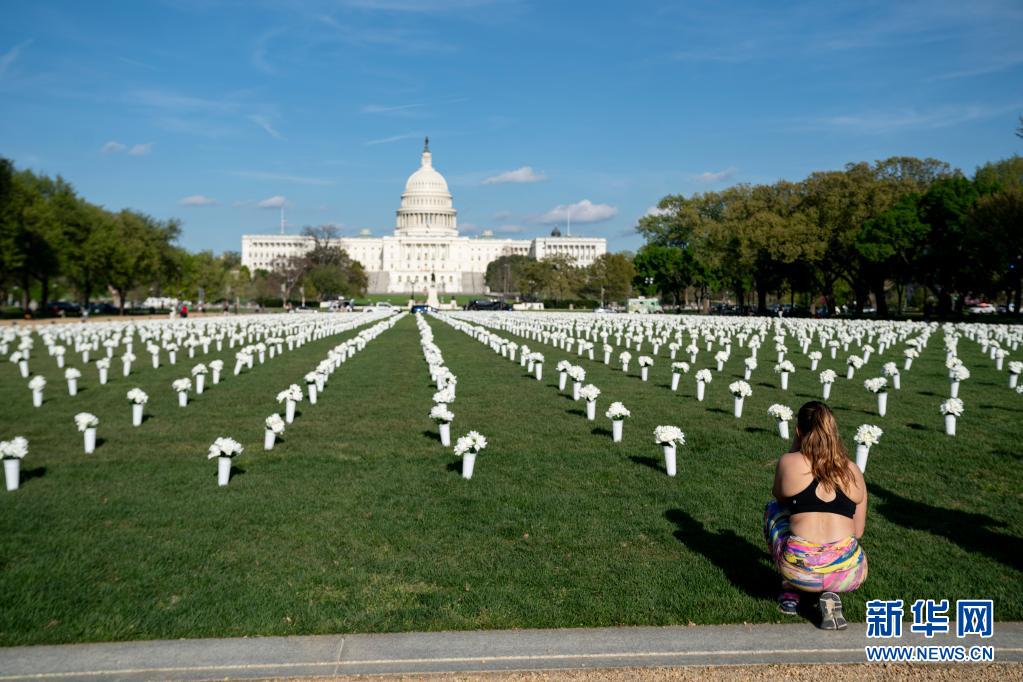 4月13日,一名女子觀看美國華盛頓國家廣場草坪上擺放的白色絹花。