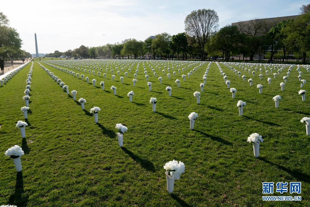 這是4月13日拍攝的美國華盛頓國家廣場(chǎng)草坪上擺放的白色絹花。