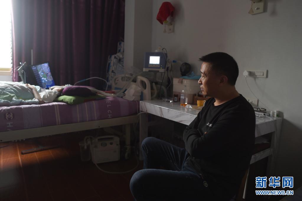父親包宗鋒坐在床邊隨時(shí)“待命”(4月13日攝)。包宗鋒被檢查出腦血管畸形,因?yàn)橐湛春⒆樱恢辈桓胰プ鍪中g(shù)。