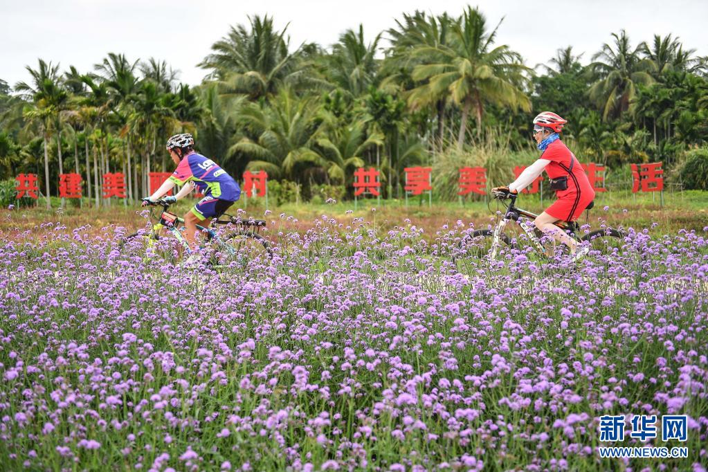 4月9日,游客在海南博鰲鎮(zhèn)南強(qiáng)村花海中騎行。