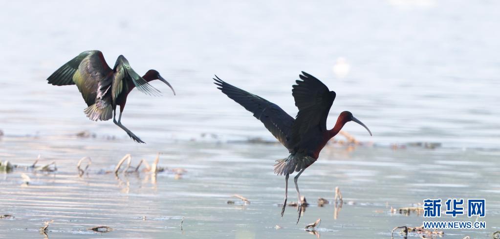 彩鹮在福建省霞浦縣福寧灣灘涂覓食、嬉戲(4月17日攝)。一對(duì)彩鹮近日現(xiàn)身福建省霞浦縣福寧灣灘涂的視頻,經(jīng)當(dāng)?shù)孛襟w播發(fā)后引起轟動(dòng),各地?cái)z影師及當(dāng)?shù)厣鷳B(tài)保護(hù)志愿者紛至沓來(lái),一睹它們的“芳容”。新華社記者 梅永存攝