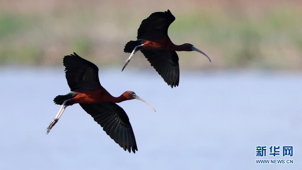 彩鹮在福建省霞浦縣福寧灣灘涂上空飛翔(4月17日攝)。一對彩鹮近日現(xiàn)身福建省霞浦縣福寧灣灘涂的視頻,經(jīng)當?shù)孛襟w播發(fā)后引起轟動,各地攝影師及當?shù)厣鷳B(tài)保護志愿者紛至沓來,一睹它們的“芳容”。新華社記者 梅永存攝