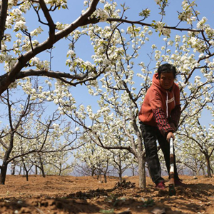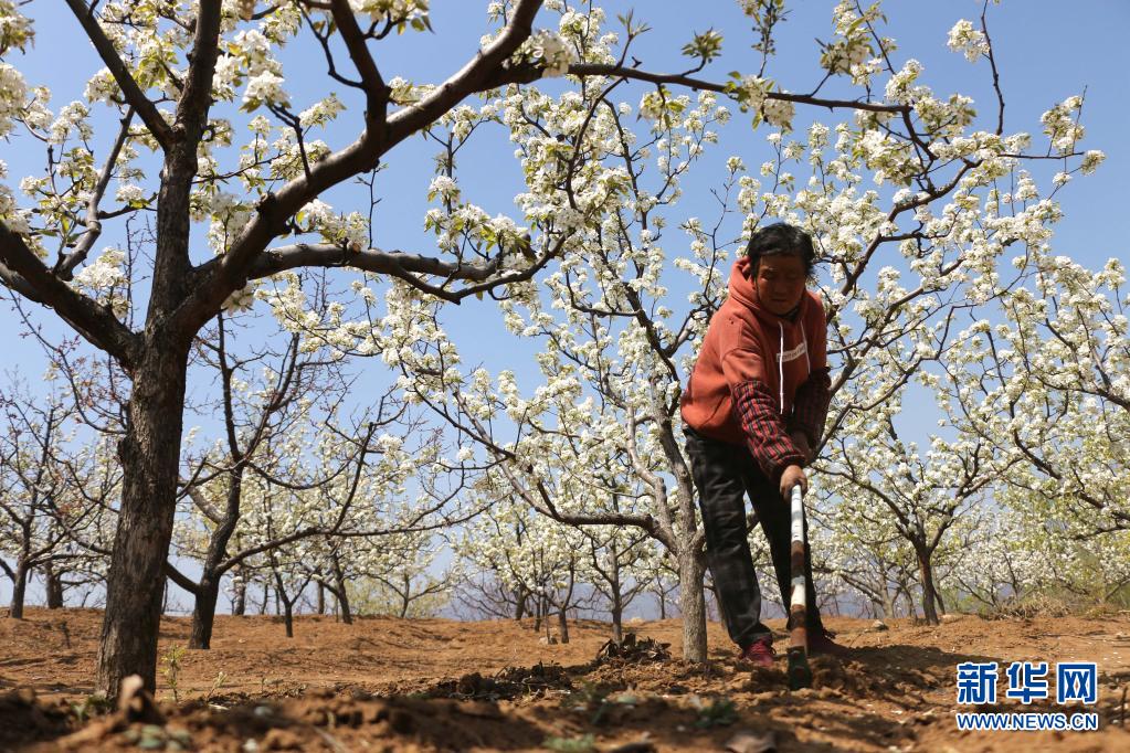 4月19日,農(nóng)民在河北省承德縣新杖子鎮(zhèn)葦子峪村梨園里除草。