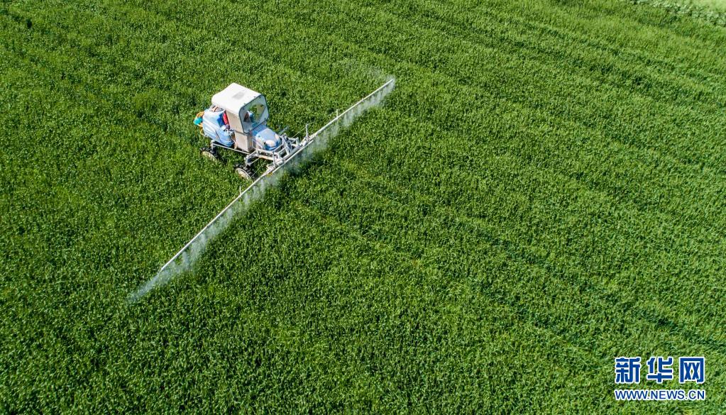 4月20日,在江蘇省海安市隆政街道聯(lián)合村,農(nóng)民駕駛自走式噴桿噴霧機(jī)在麥田噴灑農(nóng)藥(無(wú)人機(jī)照片)。