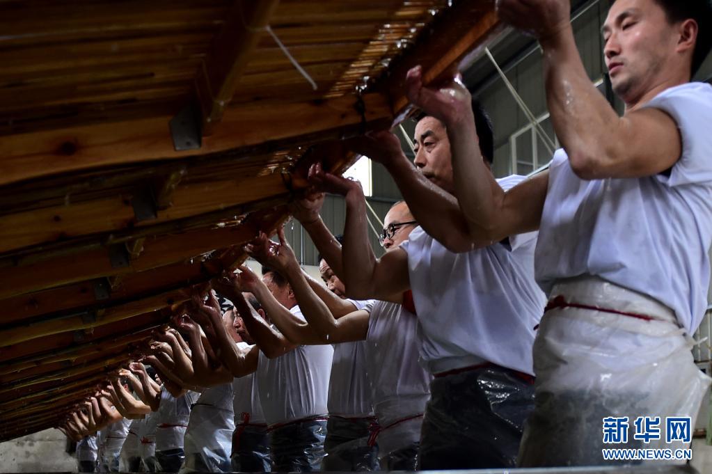 近日,在宣紙產(chǎn)地安徽省宣城市涇縣,“四丈宣紙”的抄制在一家紙業(yè)有限公司啟動(dòng)。50余名撈紙師傅操作巨型紙簾,齊心協(xié)力,在紙槽旁進(jìn)行撈紙作業(yè)。來回起落兩次,動(dòng)作整齊劃一。隨后工人們將紙簾吊起放至一邊揭下,一張巨大的宣紙便撈制成功。經(jīng)過曬、剪等工序后, 制成長(zhǎng)13.2米、寬3.6米的巨型宣紙就是“四丈宣紙”。