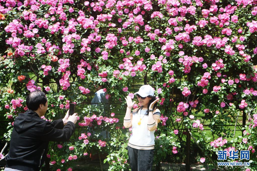 4月26日,市民在杭州市拱墅區(qū)一社區(qū)公園的月季花墻拍照留念。近日,各地鮮花盛開,吸引人們走出家門踏青賞花。新華社發(fā)(龍巍 攝)