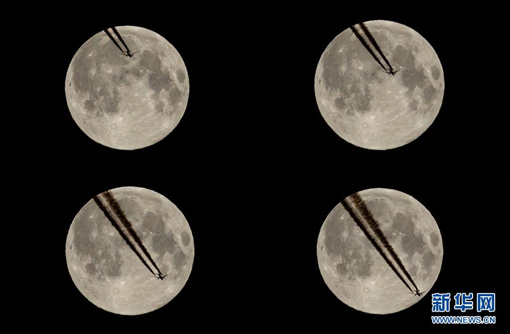 4月27日,一架飛機(jī)“飛過”法國巴黎上空的“超級(jí)月亮”(拼版照片)。新華社發(fā)(奧雷利安·莫里薩爾攝)