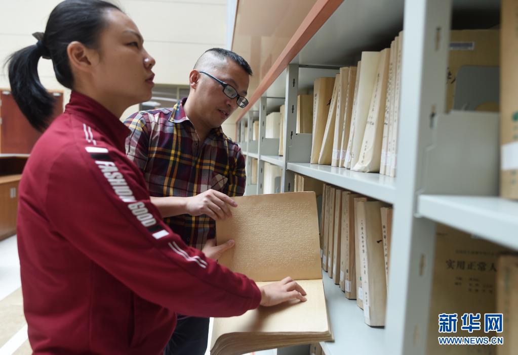 4月28日,龍泉市圖書館工作人員陸軍偉(后)向葉景芬介紹館藏的盲文書籍。新華社記者 韓傳號 攝