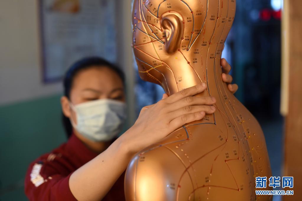 4月28日,葉景芬在自己實習的龍泉市中醫(yī)院內(nèi)感受中醫(yī)針灸穴位。新華社記者 韓傳號 攝