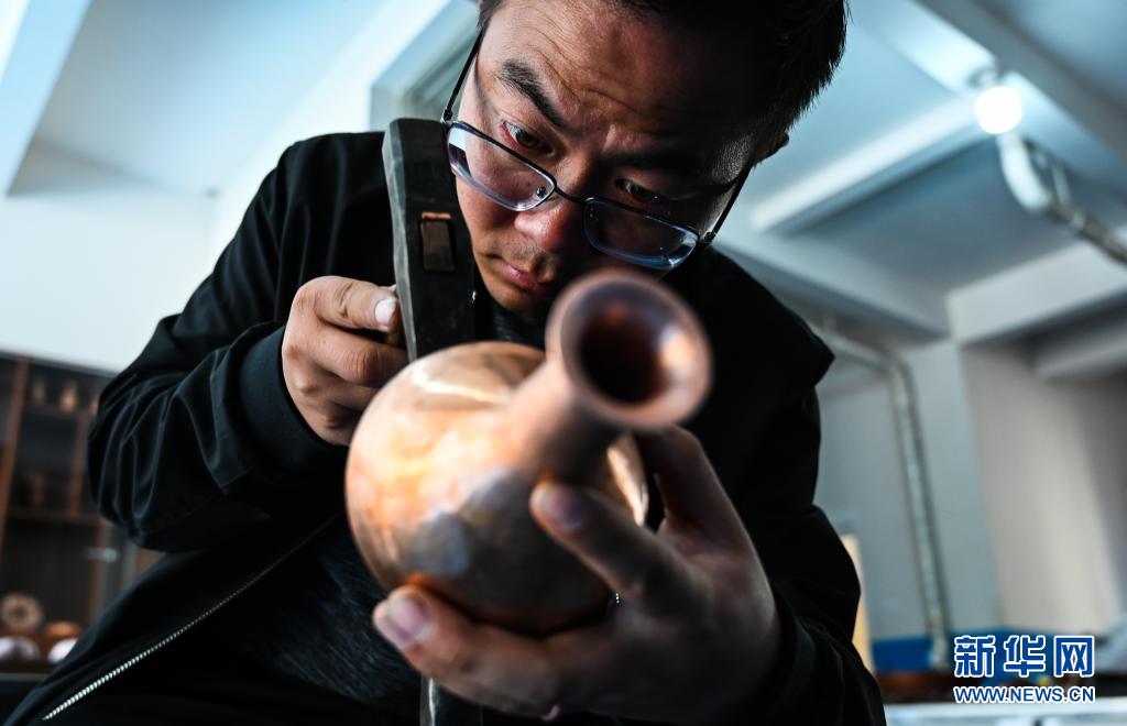 地處滇東北、烏蒙山腹地的云南會澤縣流傳著具有300多年歷史的斑銅制作工藝。斑銅工藝復(fù)雜,要采用高品位的銅為原料,經(jīng)過20余道工序制作而成。產(chǎn)品“妙在有斑,貴在渾厚”,風(fēng)格獨樹一幟。33歲的張偉是會澤“張氏斑銅”的第十三代傳人。自幼深受地域文化和家庭熏陶的他,大學(xué)畢業(yè)后,返鄉(xiāng)從事斑銅制作工作。在會澤古城的“銅匠街”,張偉創(chuàng)辦了斑銅傳習(xí)館,不斷研發(fā)斑銅新產(chǎn)品、傳承著這項非遺技藝?!鞍咩~是一種情感、一種文化,希望在我們這代人的努力下能夠更好地將它傳承下去,讓更多人了解斑銅的獨特魅力。”張偉說。