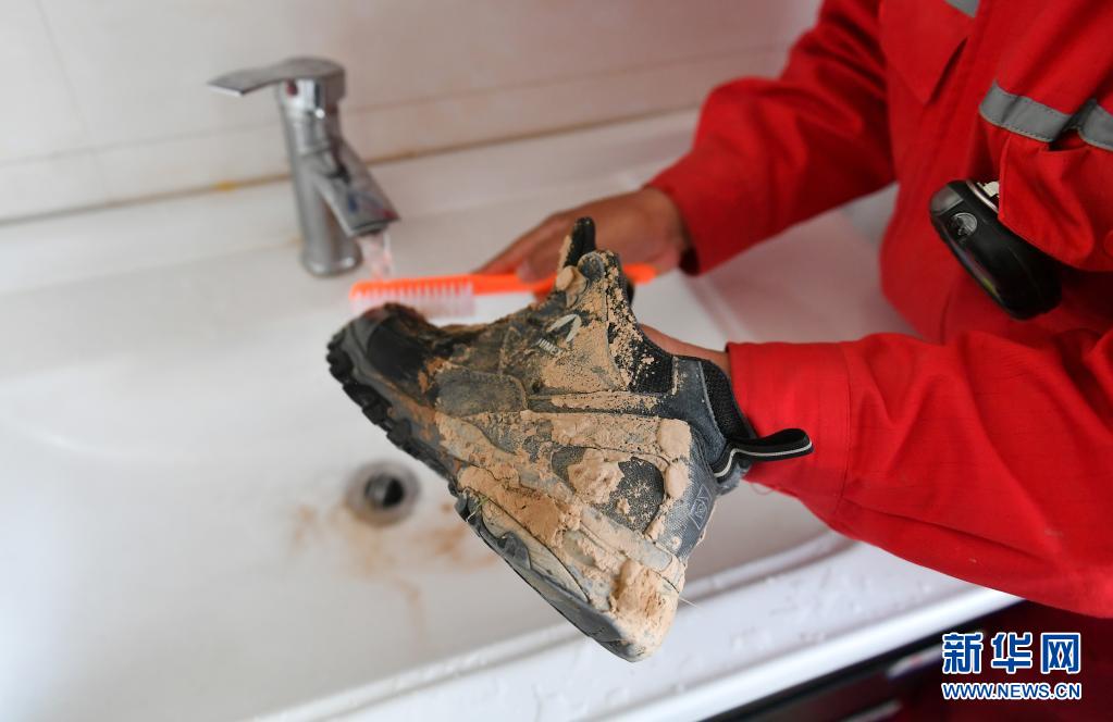 4月28日,巡線隊(duì)員侯勵(lì)峰結(jié)束巡線后清洗登山鞋。新華社記者 張博文 攝