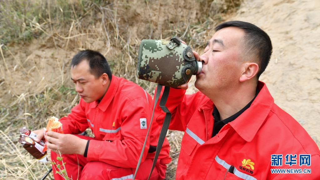 4月27日,巡線隊員張偉偉(左)、張浩軍在巡線途中吃飯。新華社記者 張博文 攝