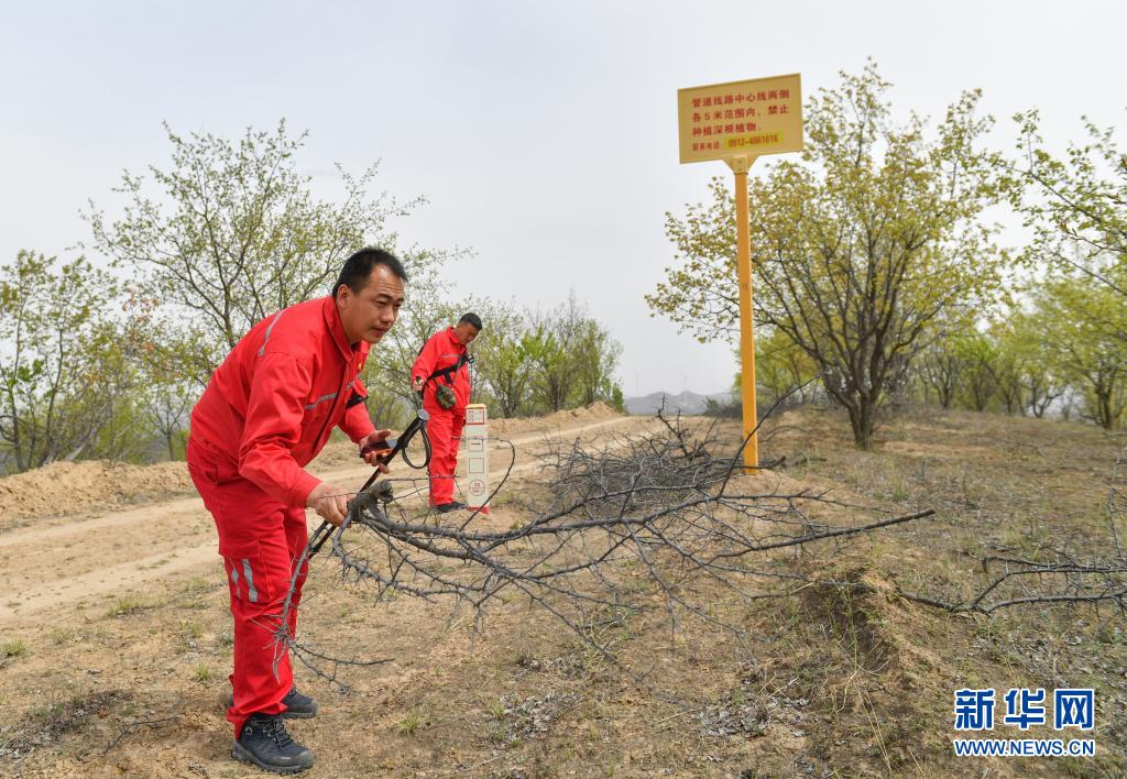 4月27日,巡線隊員張偉偉(左)在巡線途中清理天然氣運輸管線附近的易燃物。新華社記者 張博文 攝