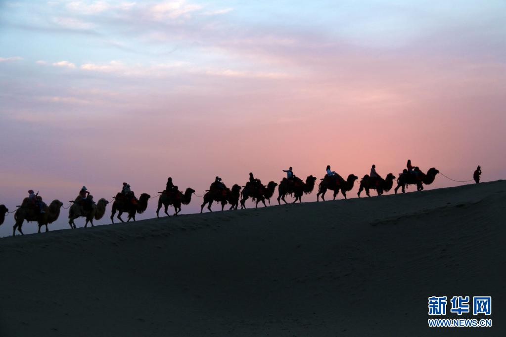 5月1日,游客在甘肅省敦煌市鳴沙山月牙泉景區(qū)游覽。