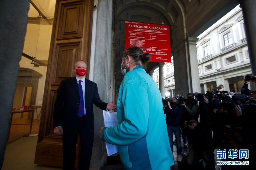 5月4日,在意大利佛羅倫薩,烏菲齊美術(shù)館館長施密特(左)在重新開放的美術(shù)館門口迎接參觀者。當(dāng)日,意大利烏菲齊美術(shù)館重新開放。美術(shù)館改建了售票處和接待處,以避免排隊(duì),并開設(shè)了十四個(gè)新展室。新華社發(fā)