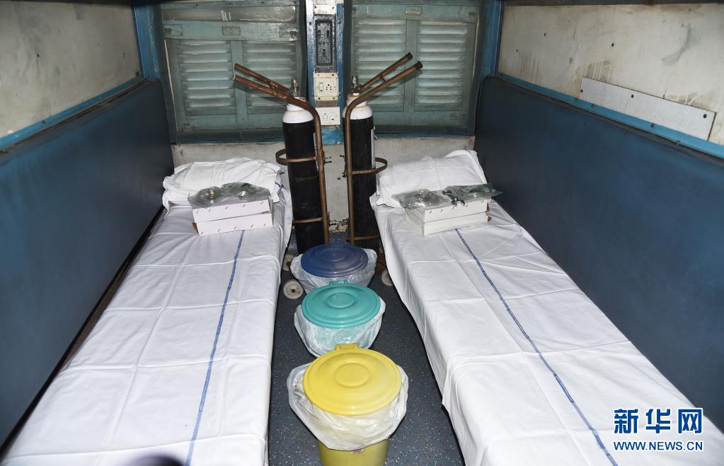 這是5月5日在印度高哈蒂火車站拍攝的改造成臨時(shí)病房的列車廂。
