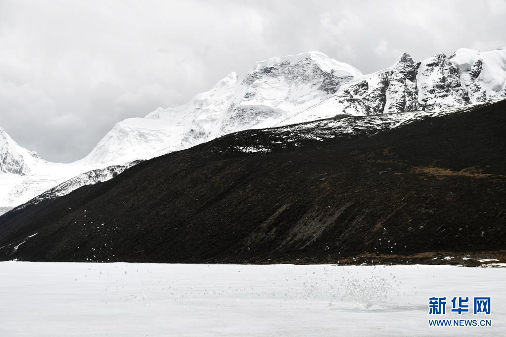 一陣強(qiáng)風(fēng)掠過薩普雪山腳下的冰湖時(shí)卷起湖面的薄冰(5月4日攝)。