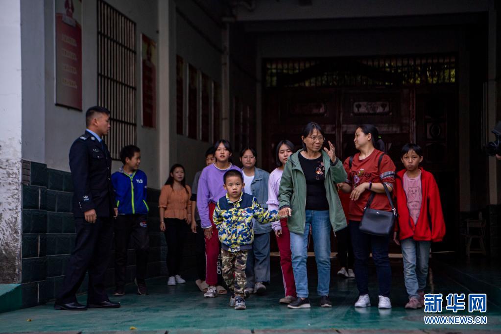 張桂梅(右三)回到華坪兒童福利院(3月25日攝)。新華社記者 江文耀 攝