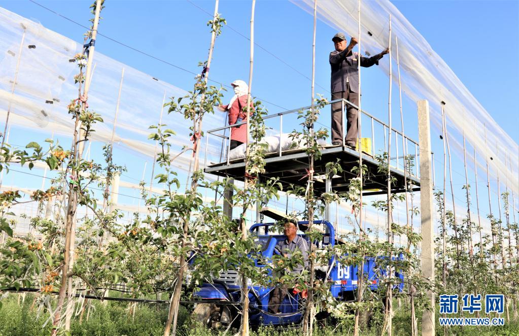 5月9日,在甘肅省平?jīng)鍪徐o寧縣城川鎮(zhèn)一蘋果有機(jī)示范園里,工人在為果園搭建防雹網(wǎng)。