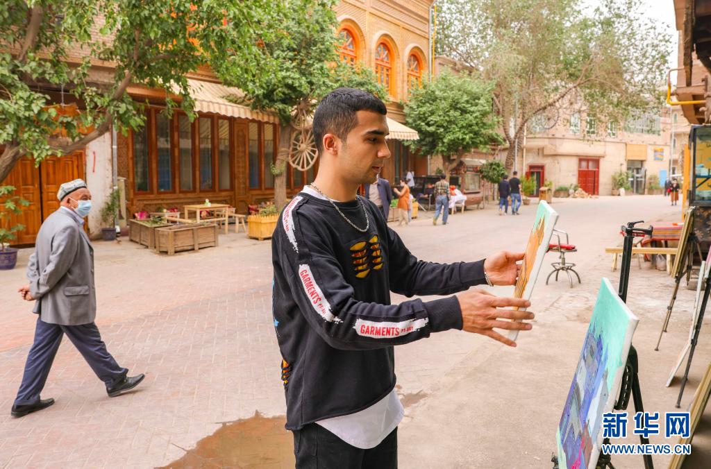 麥麥提吐爾遜江·麥麥提依明把畫好的作品擺放到工作室外的展架上,路過的行人被他的畫作吸引(5月5日攝)。新華社記者 胡虎虎 攝