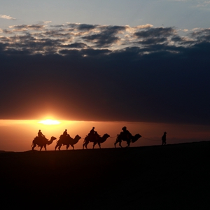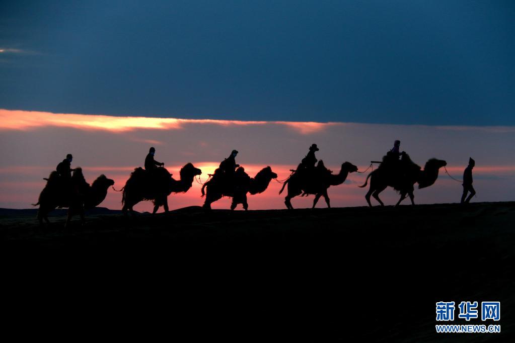 5月15日,游客騎駱駝在甘肅省敦煌市鳴沙山月牙泉景區(qū)游覽。晨光下,云彩、沙山、駝隊(duì)構(gòu)成了一幅美麗迷人的畫卷。新華社發(fā)(張曉亮 攝)
