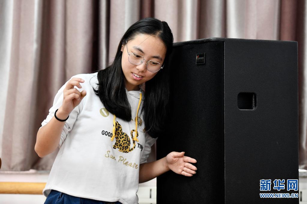 天津理工大學(xué)聾人工學(xué)院聾人舞蹈隊(duì)隊(duì)長楊凝在排練時(shí)用手接觸音響感受震動(dòng)(5月12日攝)。新華社記者 趙子碩 攝